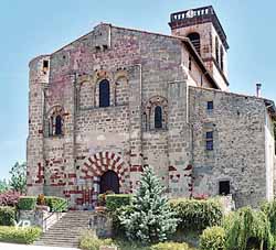 Église de style roman auvergnat édifiée durant le troisième quart du XIIe siècle en arkose, la pierre blonde locale, avec des incrustations de pierre de lave.