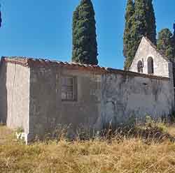 Chapelle romane du XIè s.Nef rectangulaire terminée par un choeur étroit en hémicycle voûté.A l'intérieur reste le mobilier (autel+statues) sauvées du vol et du pillage.A l'extérieur archivolte