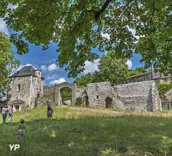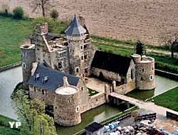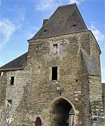 Porte d'entrée près de l'église ; deux tours carrées l'une à l'Ouest, l'autre au Nord ; fossés reliant les deux tours ; mur Nord Est attenant au donjon