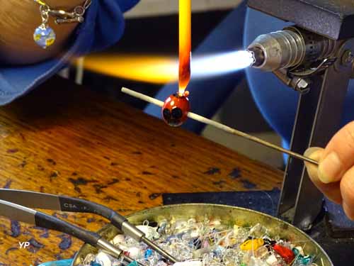 Réalisation de perles en verre de Murano. Démonstration de filage de verre. Exposition-vente de bijoux en verre filé.
