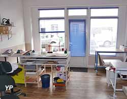 Animation d'atelier d'apprentissage de la reliure, adultes et enfants L'atelier de restauration est un espace de 40 m2 au rez-de-chaussée d'un immeuble avec une vitrine.