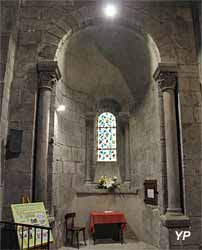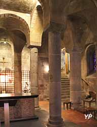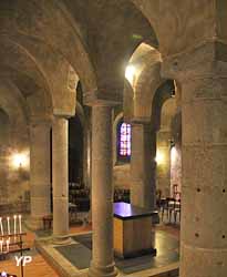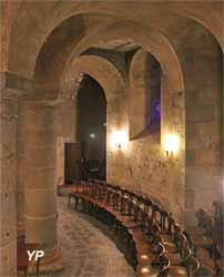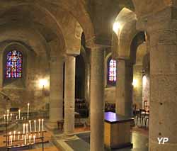 Sous le choeur se trouve la crypte et ses huit colonnes trapues et courtes. Elle correspondent à celle de l'hémicycle du sanctuaire. Quatre colonnes disposées en carré, au centre, supportent le pavement du chœur.