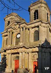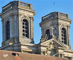 Reconstruite en 1768, l'imposante façade néo-classique se compose de deux tours encadrant un avant-corps sommé d'un fronton. Celui-ci est surmonté de deux statues monumentales représentant la Synagogue (à gauche) et l'Eglise (à droite). Chacun des trois niveaux est scandé par des colonnes ou des pilastres aux ordres respectivement dorique, ionique et corinthien. Durant la Révolution, certains éléments de décor ont été détournés de leur symbole initial. Ainsi, au-dessus du portail nord (à gauche), la mitre et la crosse épiscopales ont été transformées respectivement en bonnet phrygien et en faisceau de licteur.