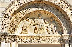 la façade abondamment sculptée constitue la pièce maîtresse de l'édifice. Plusieurs grands thèmes y sont figurés : l'Évangélisation, l'Ascension du Christ et le Jugement Dernier. A droite du portail, se trouvent une scène de chasse et une frise sculptée représentant un combat de cavaliers inspiré de la Chanson de Roland.