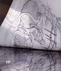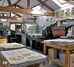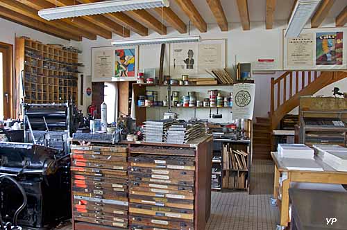 Un espace d'inspiration, d'expérimentation, de réalisation dans de vastes ateliers. De belles presses et une collection exceptionnelle de plusieurs tonnes de caractères de plomb de toutes tailles sont à disposition des artistes.