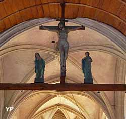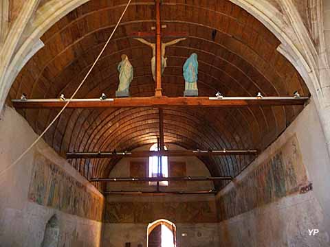 A l'intérieur, une poutre de gloire portant un crucifix en bois accompagné d’une statue de la Vierge et d’une statue de saint Jean (bois sculpté, XVe siècle).