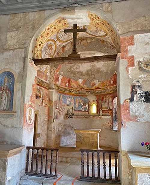 s ur un enduit déjà ancien. Un Christ en majesté, entouré des quatre symboles tétramorphes des Evangélistes, recouvrait le cul-de-four. Au revers de l'arc-triomphal est peint un Jugement dernier : Jésus bénissant accompagné de Marie et Jean accueillent des morts en linceul, réveillés par les anges musiciens occupant le berceau de la travée droite du choeur, qui se lèvent de leurs tombeaux pour être couronnés. Le thème de l'Enfance du Christ ou Vie de la Vierge est illustré tout autour du choeur par l'Annonciation, la Nativité, l'Adoration des Mages, la Présentation au Temple, le Massacre des Innocents et la Fuite en Egypte. (Sont encore à signaler plusieurs apôtres se tenant dans des médaillons ainsi qu'une sainte Marguerite dans l'embrasure de la fenêtre de l'abside.