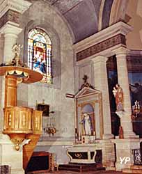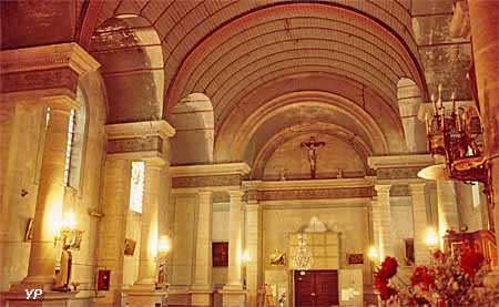 Belle voûte en arceaux reposant sur une double rangée de colonnes doriques décalées contre les murs latéraux, libérant la vaste nef centrale illuminée par des vitraux de belle facture. Grandes fresques murales dans le choeur.