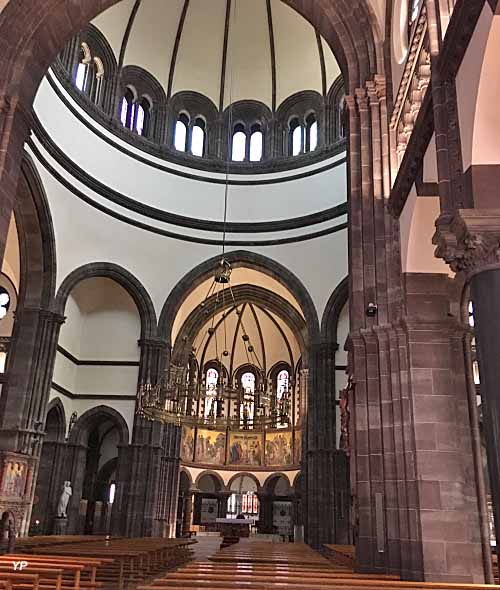 Ensuite, stylistiquement, en cette période de la fin du 19e s. : de façon prédominante, elle s'inspire du style rhénan de transition entre le roman et le gothique, mais elle est également fortement empreinte de la Renaissance italienne par sa vaste coupole, la plus importante d'Alsace.