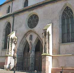Un couvent de Chanoines augustins est fondé au XIIIe siècle à Ribeauvillé. Son église est bâtie dans la première moitié du XVe siècle : dépourvue de transept, elle est coiffée d'un petit clocher effilé à la jonction de la nef et du choeur. Les Chanoines étant expulsés à la Révolution et leur couvent restant vide, le Père Bruno MERTIAN en fait l'acquisition en 1819 ; il devient ainsi la Maison-Mère des Soeurs de la Divine Providence, congrégation fondée à Molsheim en 1783 par l'abbé Louis Kremp. On remarquera le portail gothique (place de l'Hôtel de ville) avec une statue de la Vierge à l'enfant. La nef remaniée au XVIIIe siècle présente une décoration baroque et un plafond peint par Jean-Baptiste KAESS, artiste de Ribeauvillé. Dans le choeur gothique subsistent les boiseries du XVIIIe siècle aux motifs remarquables par leur finesse et leur variété. Ces motifs se retrouvent sur les confessionnaux de la nef, meubles datés de 1764. De la même à ©poque, la porte d'entrée donnant sur le couvent a gardé l'emblème des Augustins : un coeur enflammé posé sur le livre de la Règle, ainsi que la mitre et la crosse épiscopales. Les scènes du Chemin de Croix ainsi que le maître-autel sont l'oeuvre de Peter Paul METZ, sculpteur wurtembergeois (fin du XIXe siècle).