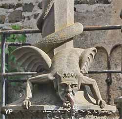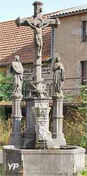 A l'extérieur, une fontaine-calvaire en pierre sculptée spectaculaire. Le socle principal, au centre, percé de deux robinets d'approvisionnement du bassin, supporte une croix. Les socles latéraux, plus petits, supportent les statues de la Vierge et de Saint-Jean. Un dragon ailé à la queue enroulée autour du fût de la croix, crache l'eau par sa gueule.