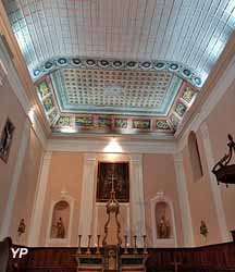 L'église possède un plafond protégé au titre des Monuments Historiques. Ce plafond, en bois peint et à caissons, est décoré en trompe-l'oeil au-dessus du choeur. Il émane de celui-ci une symbolique particulière. Sur les murs, des décors en gypseries, des pilastres, des arcs et des niches témoignent d'une grande richesse passée. Cette église possédait une "litre", bande funéraire, intérieure et extérieure, de couleur noire ornée des blasons du Seigneur . La bande de la litre externe fait le tour de l'église à mi-hauteur. Seules subsistent au Nord, sur cette bande décolorée des traces de blasons. Son clocher-mur, à trois arcades, est particulier pour la région.
