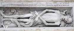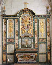 ![]() Église Saint-Gervais Saint-Protais - transi "Qui que tu sois, tu seras terrassé par la mort, restes là, prends garde, pleure. J’étais ce que tu es, tu seras ce que je suis, fais maintenant ce que tu voudrais avoir fait quant tu te mourras" (doc. Yalta Production) | ![]() Église Saint-Gervais Saint-Protais - retable (XVIIIe s.) (doc. Yalta Production) |