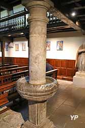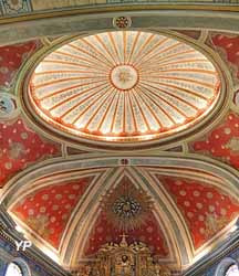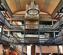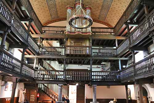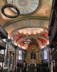 La nef unique est bordée de trois rangées de galeries en bois sculpté réservées traditionnellement aux hommes,