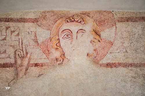 Dans le choeur, restauré en 2019, subsistent des peintures murales monumentales exceptionnelles (XII°/XIII°s.). Sur les trois faces du choeur carré, étaient représentés sur trois registres : un drapé, le cortège des 12 apôtres, le tétramorphe (symboles des 4 évangélistes) et un Christ en majesté.