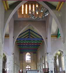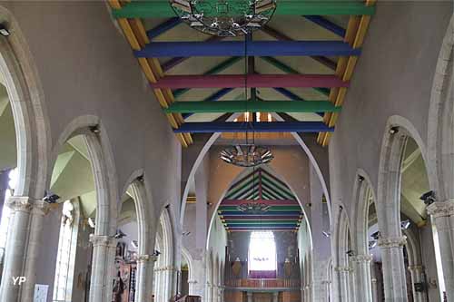 Les travaux de reconstruction vont s'échelonner de 1947 à 1951. Ils reprennent l'élévation des anciens murs de la nef, mais la toiture est simplifiée. La croisée du transept est couronnée d'une tour lanterne carrée originale éclairée par des verrières en ogive.