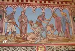 La nef est marquée par un puissant décor du XIXe siècle : peintures murales représentant le chemin de croix grandeur nature, et vitraux.