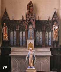 Au-dessus du portail (début XVIe siècle), Christ de Pitié, mains liées, attendant le supplice. À droite, Saint-Jean Evangéliste. A gauche, Saint-Mathieu.
