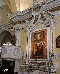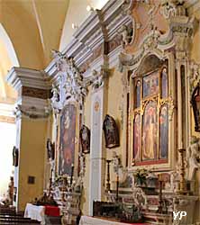 L’église possède six retables du XVe siècle sur les neuf initiaux : le plus grand, celui de sainte Marguerite et celui de saint Pierre et saint Paul sont attribués à Louis Bréa ; saint Antoine de Padoue peint par Jean Canavesio ; saint Bernard de Menthon :