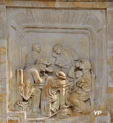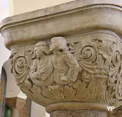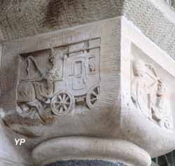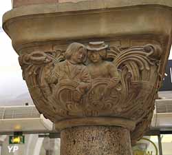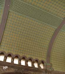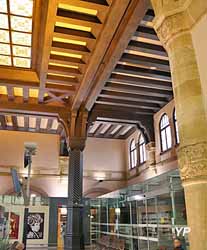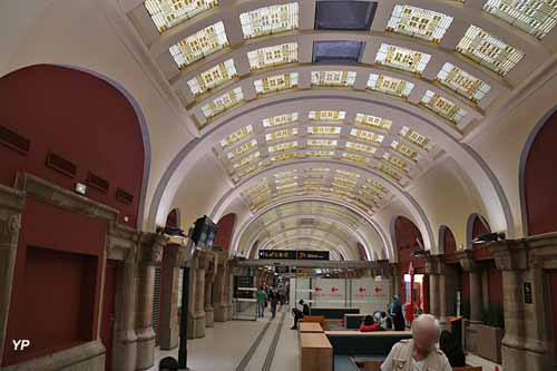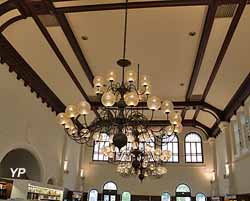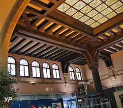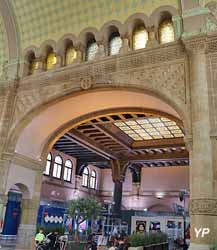 À l'intérieur, jouxtant le salon d’honneur, le buffet de la gare est riche d’un décor de boiseries travaillées et de frises peintes. Des bas-reliefs illustrant les thèmes du voyage, des moyens de communication et de transports, avec des références orientales. Toutefois, on discerne clairement les différences d'importance accordées aux trois classes de voyageurs, les plus modestes devant se contenter d'un repas sorti du sac, alors que la bourgeoisie bénéficie d'un décors particulièrement riche.