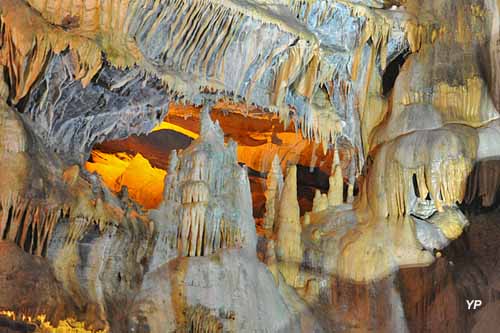 Joyau de la reculée situé à 120m sous terre, les grottes de Baume-les-Messieurs s"ouvrent sur un un long couloir de 70 m, véritable nef d'église. Sur 500 m de galeries aménagées, se succèdent salles de 20 à 70 m de hauteur, rivière et lac souterrains, chauve-souris et crevettes aveugles, jeu de sons et lumières. Elles constituent un lieu total de dépaysement.