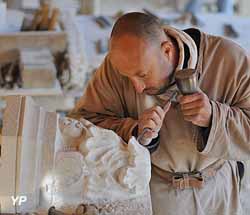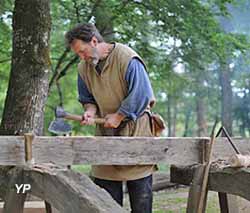 ![]() Tailleurs de pierre - Taille d'un culot de la clé de voûte de la chapelle (doc. Clément Guérard) | ![]() Bûcheron - Equarissage fût de chêne (doc. Clément Guérard) |