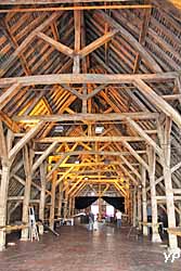 Le bâtiment n'a pas de fondations, les 66 piliers de chêne reposant sur des dés en pierre de Ranville.