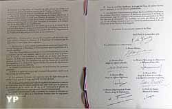 ![]() Hôtel de Bourvallais - loi constitutionnelle relative à l'élection du président de la République au suffrage universel signée par le général de Gaulle le 6 novembre 1962 (doc. Yalta Production) | ![]() Hôtel de Bourvallais - sceau pendant en cire jaune de la République (1962) (doc. Yalta Production) |
