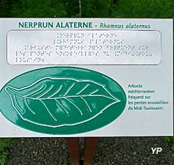 ![]() Nerprun alaterne et son panneau en braille (doc. Association Rando-Plaisirs) | ![]() Nerprun alaterne et son panneau en braille (doc. Association Rando-Plaisirs) |
