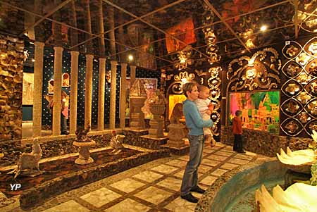 Dans le Palais minéral, animaux mythiques et divinités se parent des plus beaux minéraux. La Féerie des coquillages est une œuvre d’art réalisée avec des coquillages du monde entier.