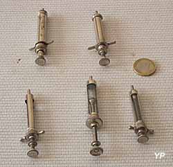 ![]() Exposition Les étranges instruments vétérinaires 1870-1970 - boule de poils trouvée dans la caillette de veau (doc. Maison de l'Élevage et du Charolais) | ![]() Exposition Les étranges instruments vétérinaires 1870-1970 - Seringues de type Pravaz (doc. Maison de l'Élevage et du Charolais) |