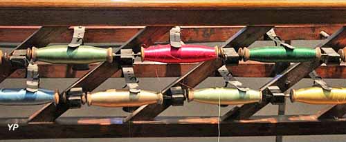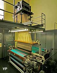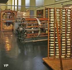 ![]() Salle des métiers à tisser et ourdissoirs (doc. Musée de Charlieu) | ![]() Métier mécanique équipé d'une mécanique jacquard (doc. Musée de Charlieu) |