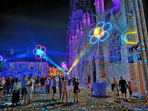 La base demeure " sur fond de mise en couleur de la cathédrale et d'ambiance sonore " mais l'animation s'adapte cette année à l'univers..... du peintre Alain Thomas. Artiste nantais majeur de la peinture naïve-primitive, il nous invite à plonger dans ses paysages foisonnants, où la nature s'épanouit dans une explosion de formes et de couleurs.