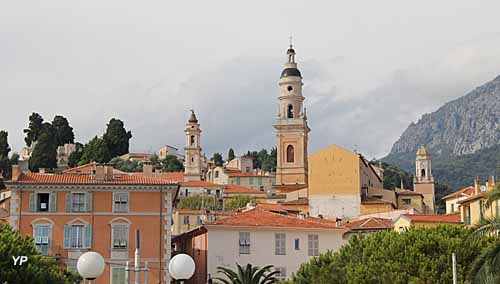 La vieille ville de Menton est construite au pied d'un éperon rocheux dominé par le cimetière marin et en contrebas, le parvis Saint-Michel et sa basilique baroque.